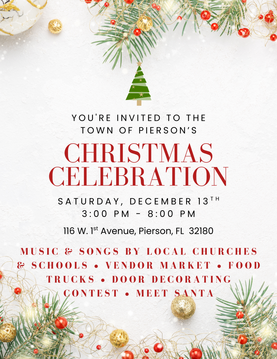 Please join us for the Town of Pierson's Christmas Celebration on Saturday, December 13th from 3:00 - 8:00PM. We will have a vendor market, food trucks, singing by local churches and schools, and a chance to meet and write letters to Santa! We hope to see you there at the Pierson Town Center, 116 W. 1st Ave.