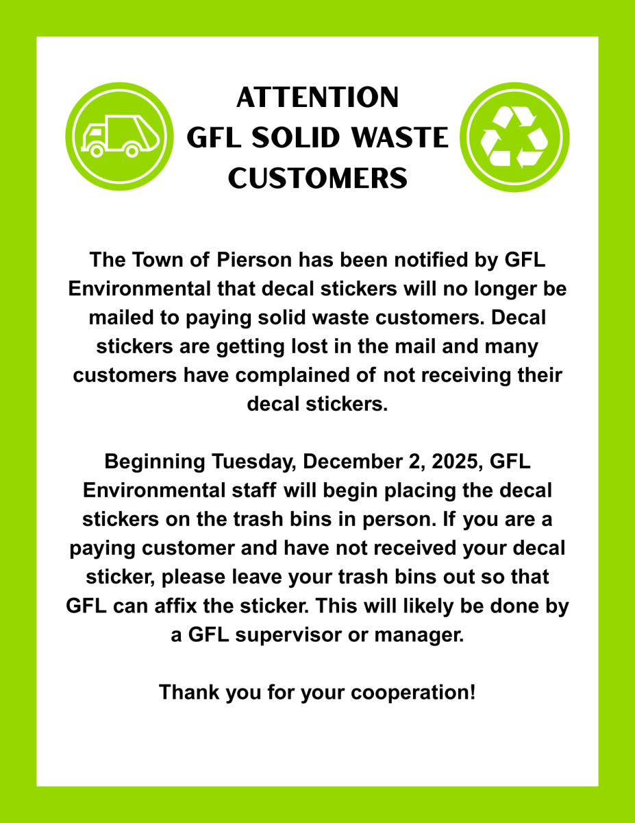 The Town of Pierson has been notified by GFL Environmental that decal stickers will no longer be mailed to paying solid waste customers. Decal stickers are getting lost in the mail and many customers have complained of not receiving their decal stickers.
