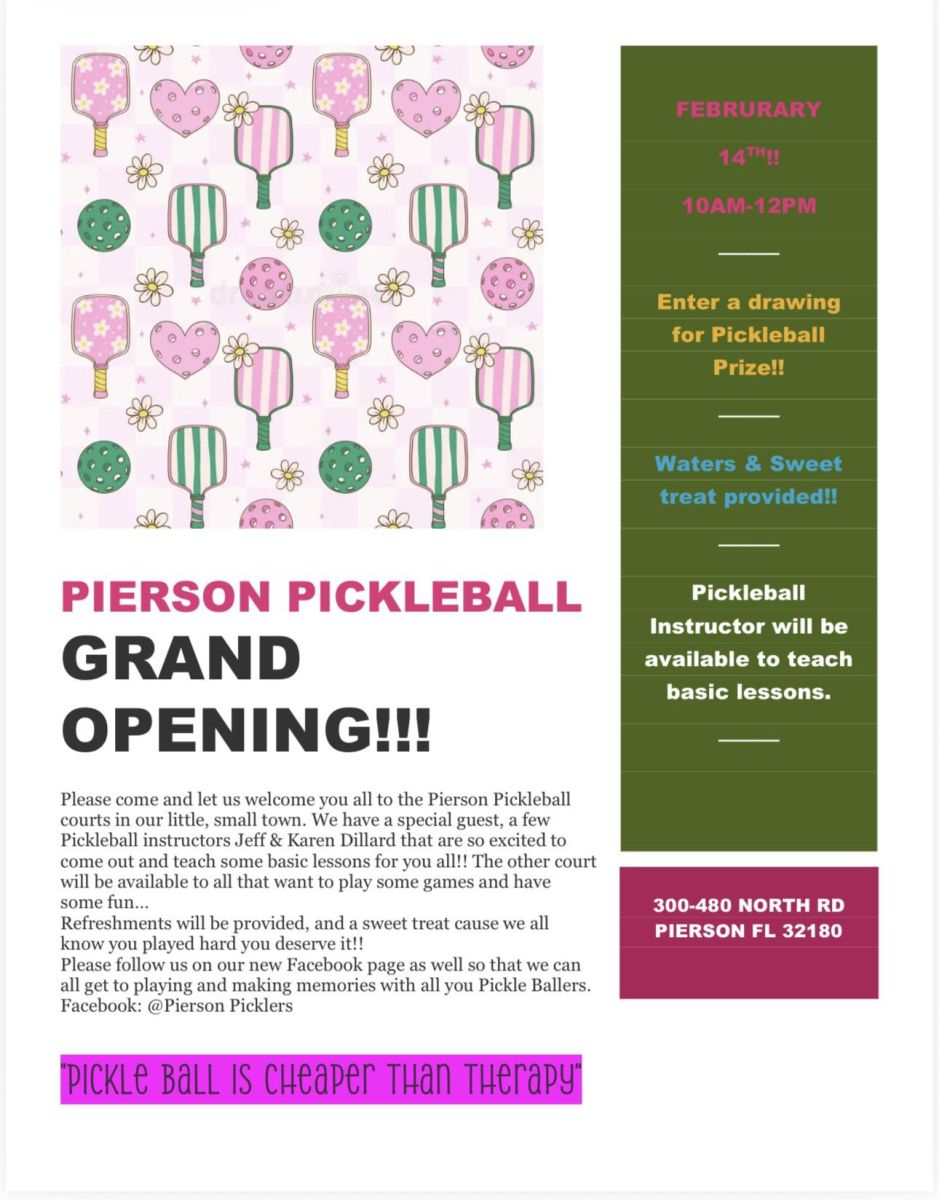 The Pierson Picklers will host a pickleball grand opening at North Road Park, 300 North Rd, on Saturday, February 14, 2026 from 10:00 AM until 12:00 PM. Pickleball instructors Jeff and Karen Dillard will be available to teach basic pickleball lessons and refreshments will be served. For more information, please visit the Pierson Picklers on Facebook by clicking here!